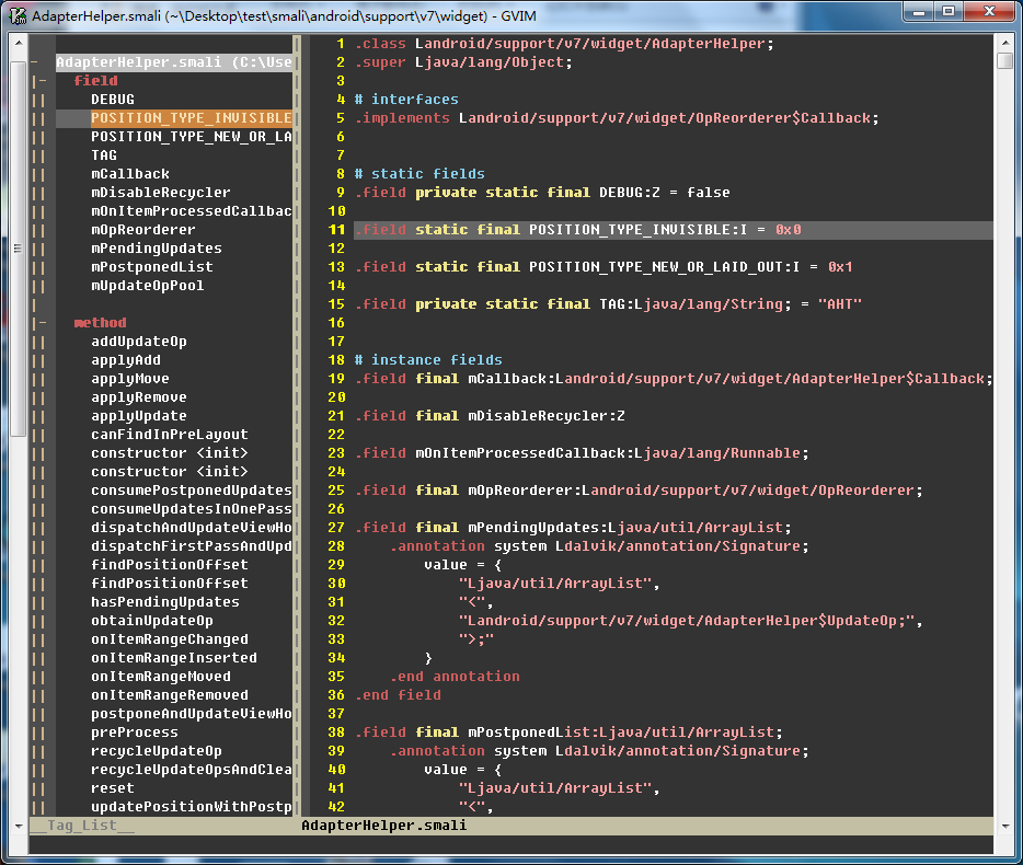 当前解决方案 Ctags 只解析、Taglist/Tagbar 只显示了 field 和 method 两类 tag,我对此的原理不是很懂,但是猜想应该是上面 .ctags 文件里的 --regex-smali 里我们只告诉了 Ctags 如何解析这两种 tag,本来考虑后续有时间把 class 等更多内容做进来,但转念一想,一个 smali 文件里也就一个类,这种需求似乎不那么强烈,遂作罢。