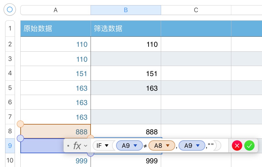 第二个念头是使用公式,数据已经排序,需要保留第一次出现该值的那一行,那么可以比对本行值与上一行的值,如果相等则说明不是第一次出现,应删除,如果不等则说明是第一次出现,应保留。沿这个思路很简单地用一个 IF 就解决了问题: